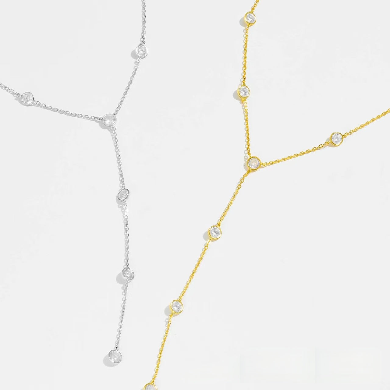 Elevate your style with the captivating elegance of our Dazzling Droplet Lariat Necklace. This exquisite necklace showcases a unique and flattering 'Y' or lariat design, meticulously crafted from premium Silver S925 sterling silver. Along its delicate chain, a series of brilliant, bezel-set simulated diamonds (or cubic zirconia) are gracefully spaced, leading to a charming drop that elongates the neck and adds a touch of sophisticated sparkle.