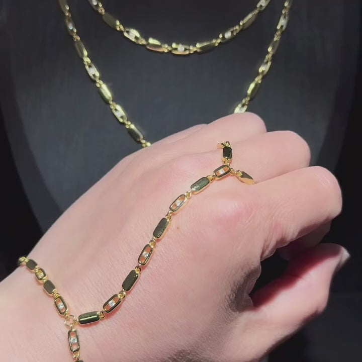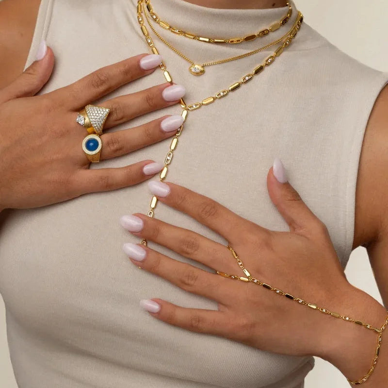 Discover contemporary elegance with our "Modern Link" collection, featuring a captivating choker, a sophisticated Y necklace, and a unique hand chain. Each piece showcases an innovative link design, where elongated oval links are artfully interspersed with tiny, shimmering cubic zirconia stones, creating a subtle yet brilliant sparkle. Available in both luxurious 18K gold-plated and sleek silver-plated finishes, this collection offers versatile pieces that can be worn together for a coordinated statement or individually to complement any look.